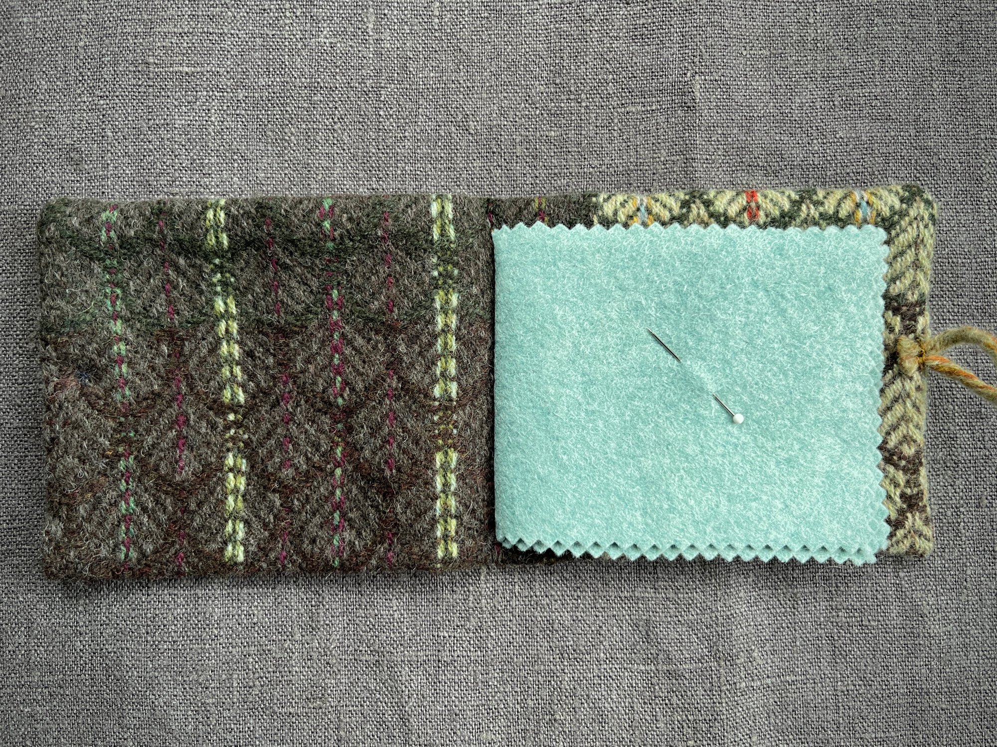 Patchwork style handwoven Merino lambswool needle/pin case with 4 felt pages