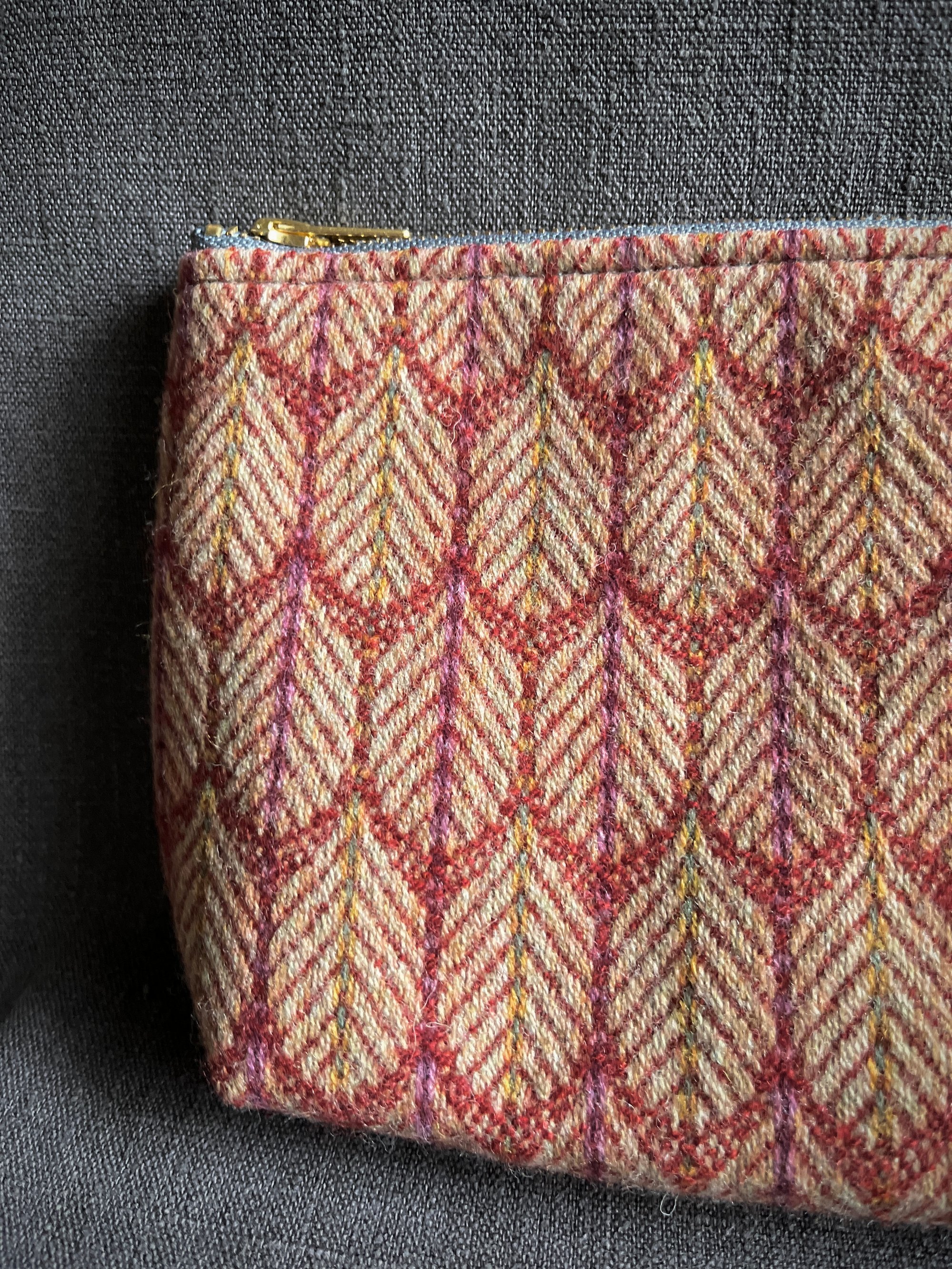 Grey poly/cotton lining. Brass zip.